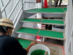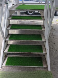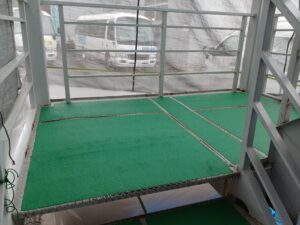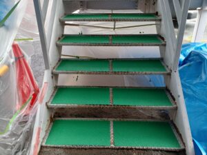 縞鋼板の階段は濡れるととても滑るので、滑り止め対策として緑のシートが張り付けてありました。
