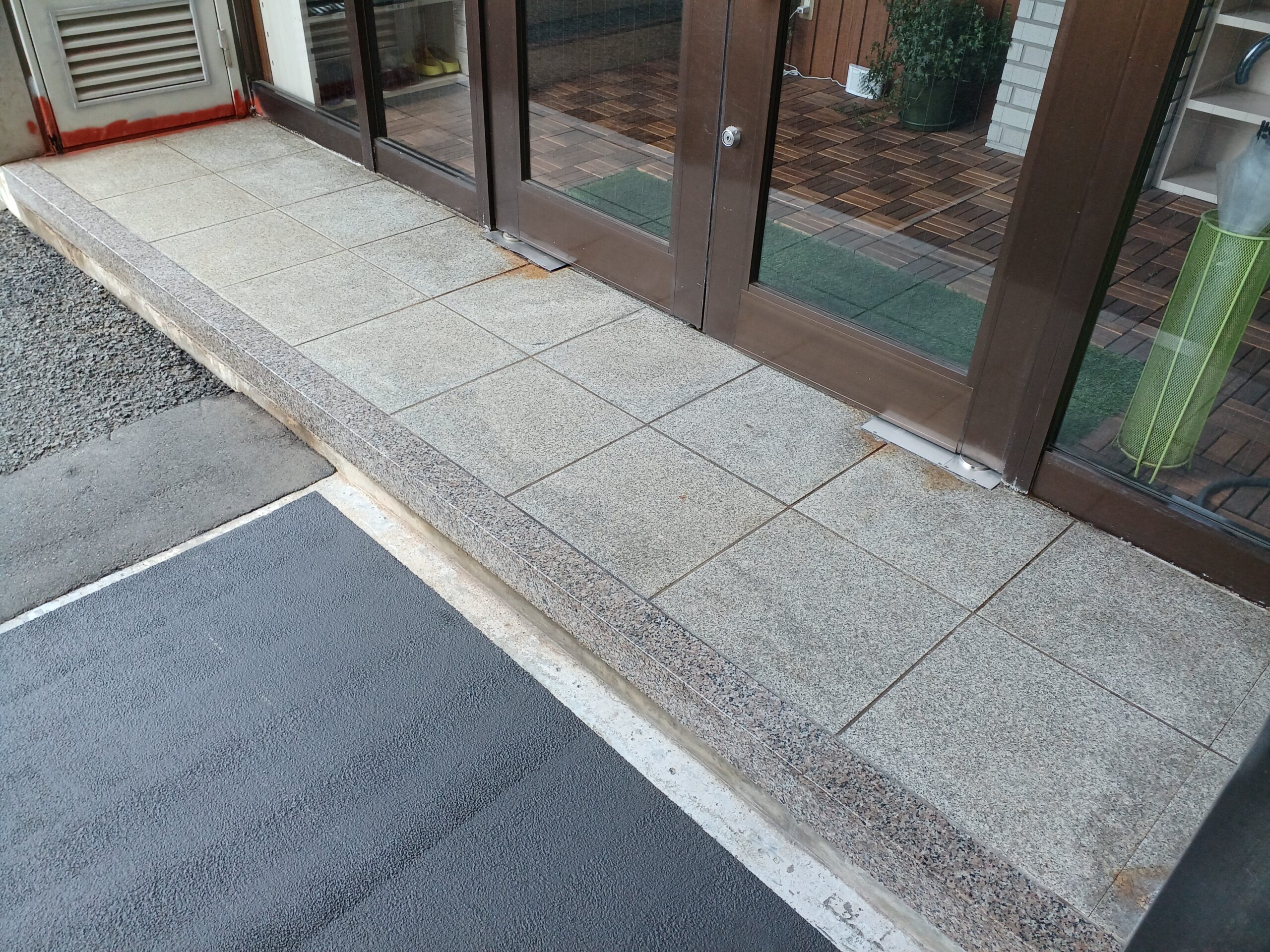 玄関入口は石材タイルの色合いを邪魔しないクリアグリップで防滑施工をします