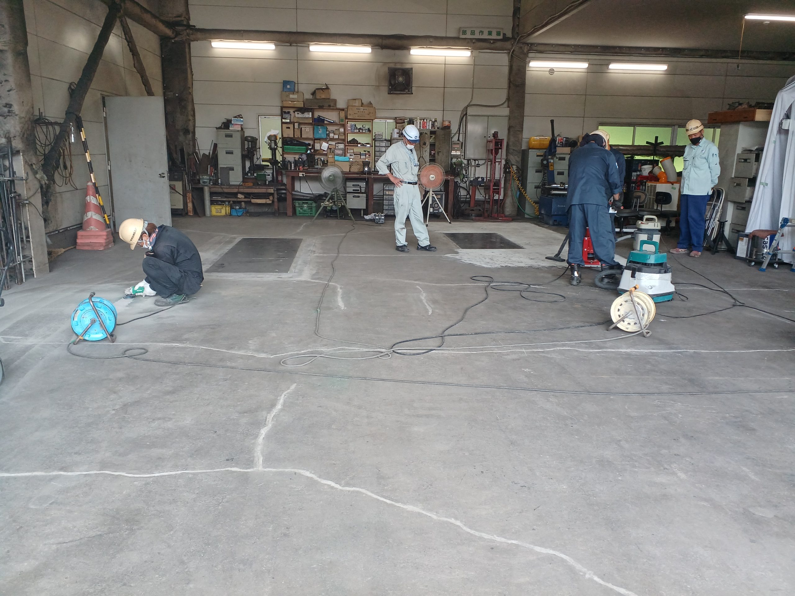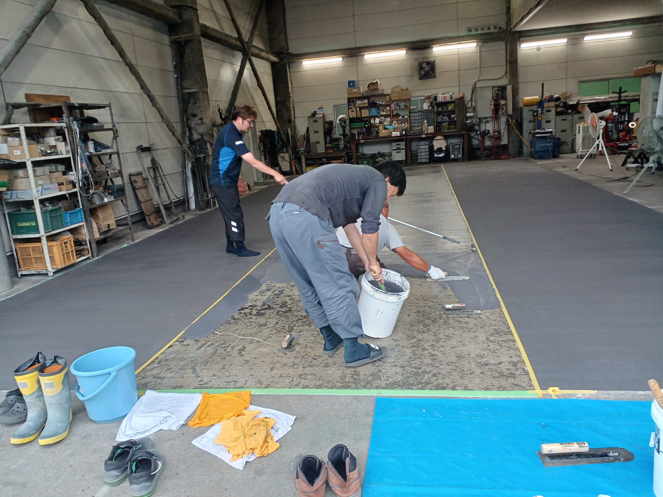 クラックを埋める→そして鉄板と床の段差を埋める→全体を均し、そして防滑材の密着度をあげるように研磨!